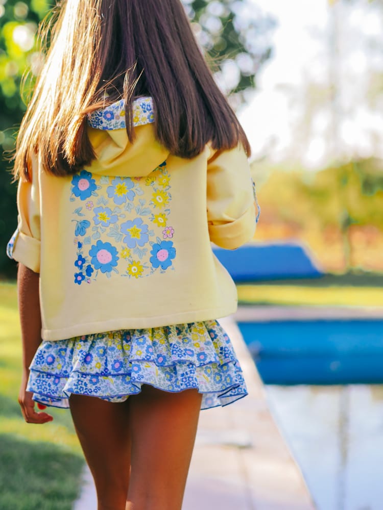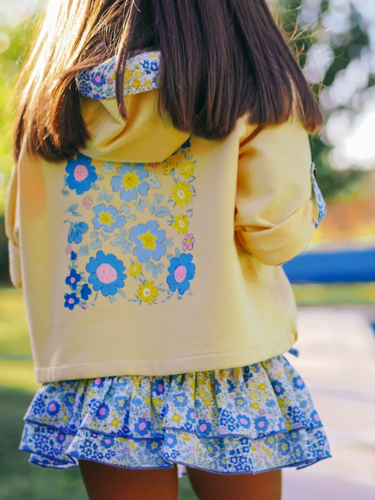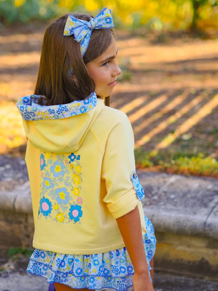 Sudadera preciosa que se le recogen las mangas y lleva capucha y falda volante con goma. Esta justo en talla